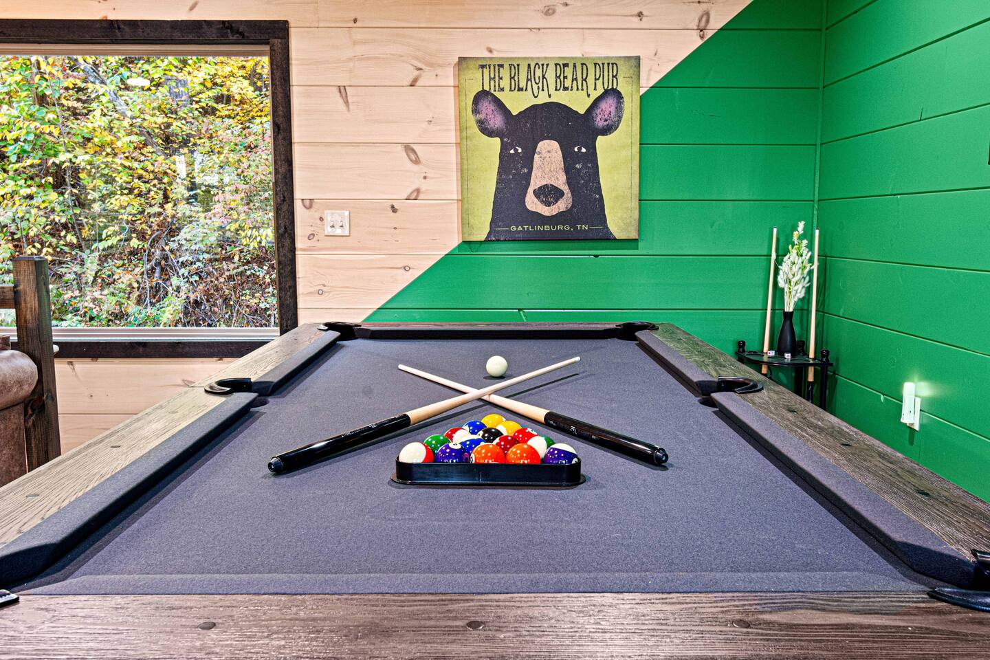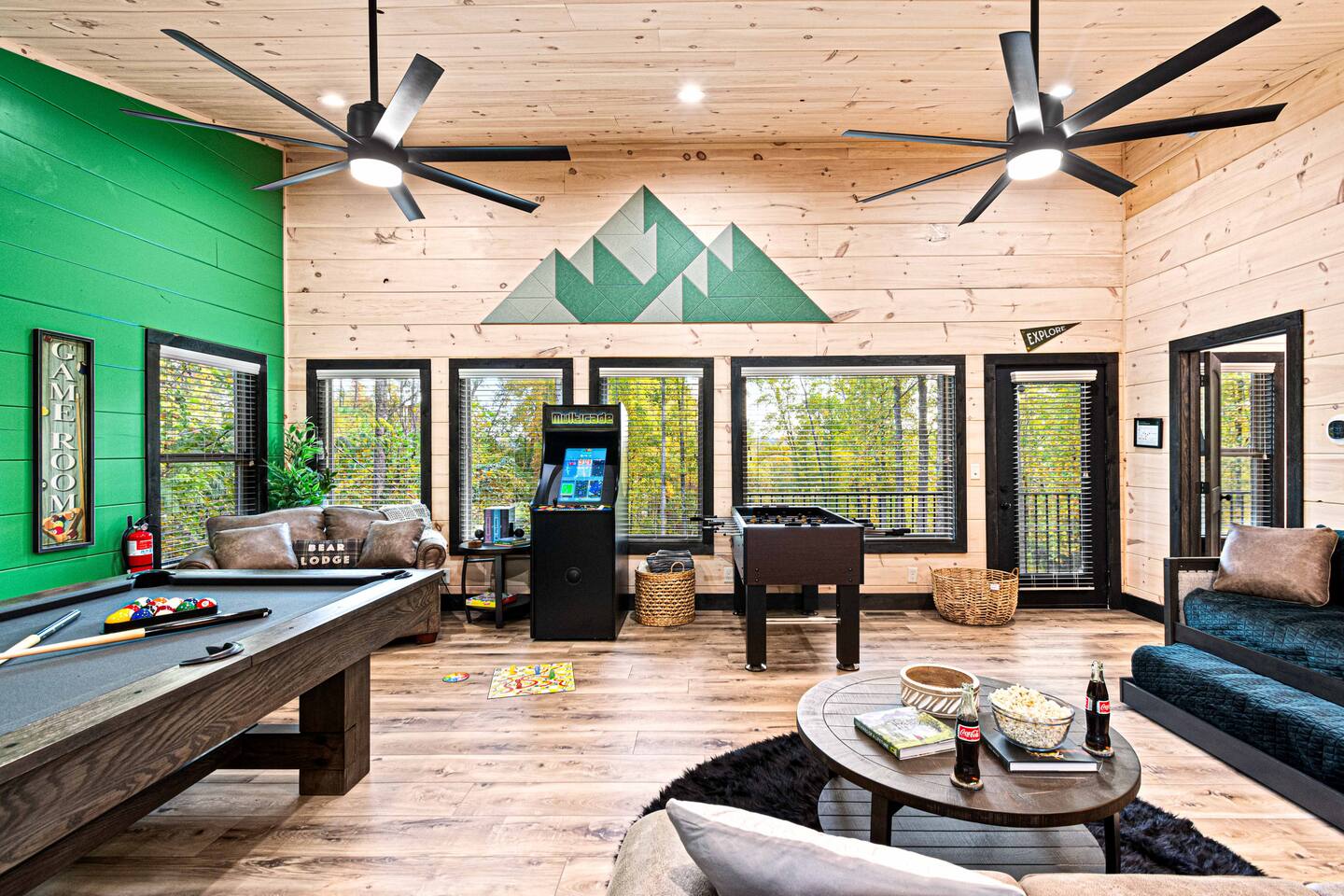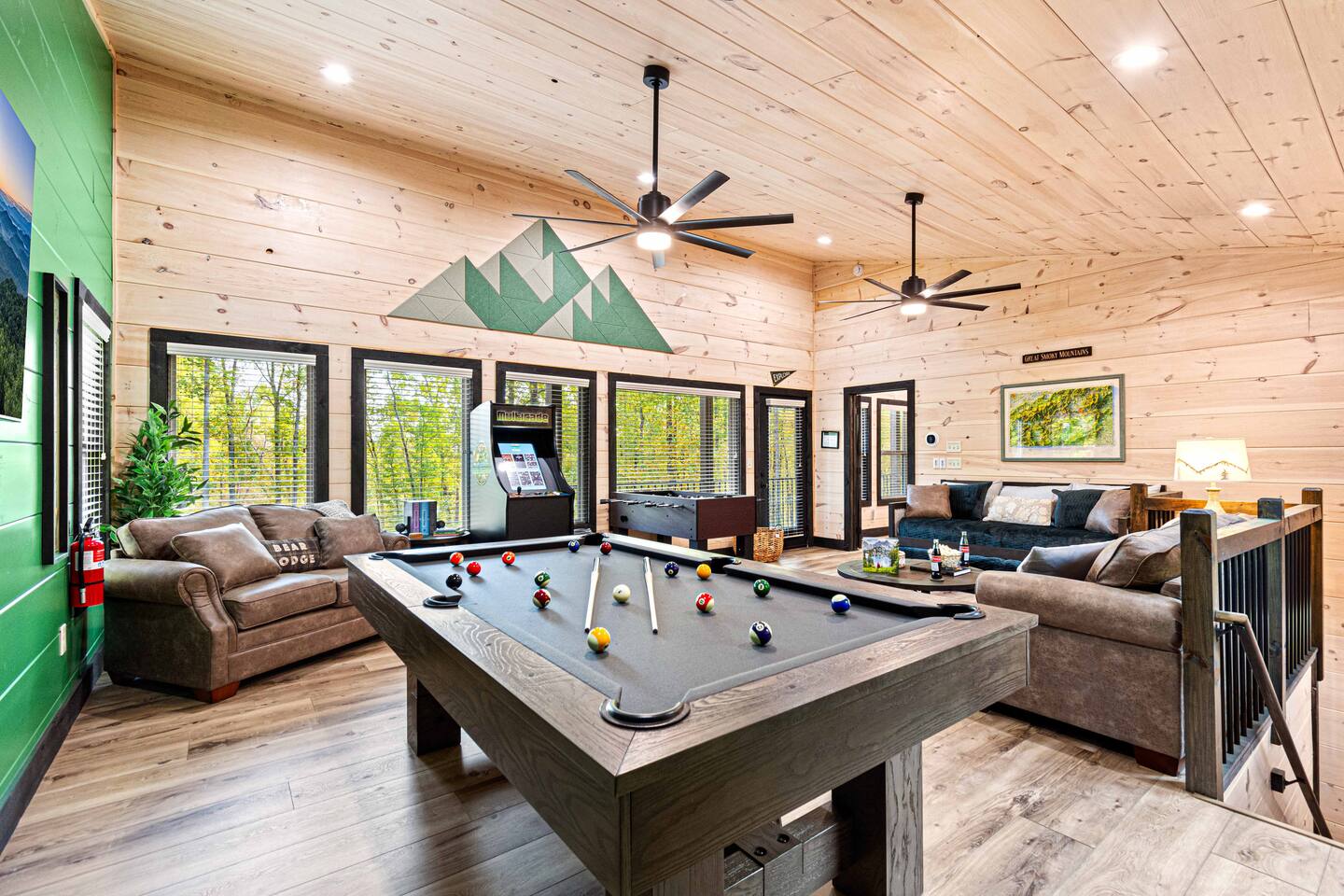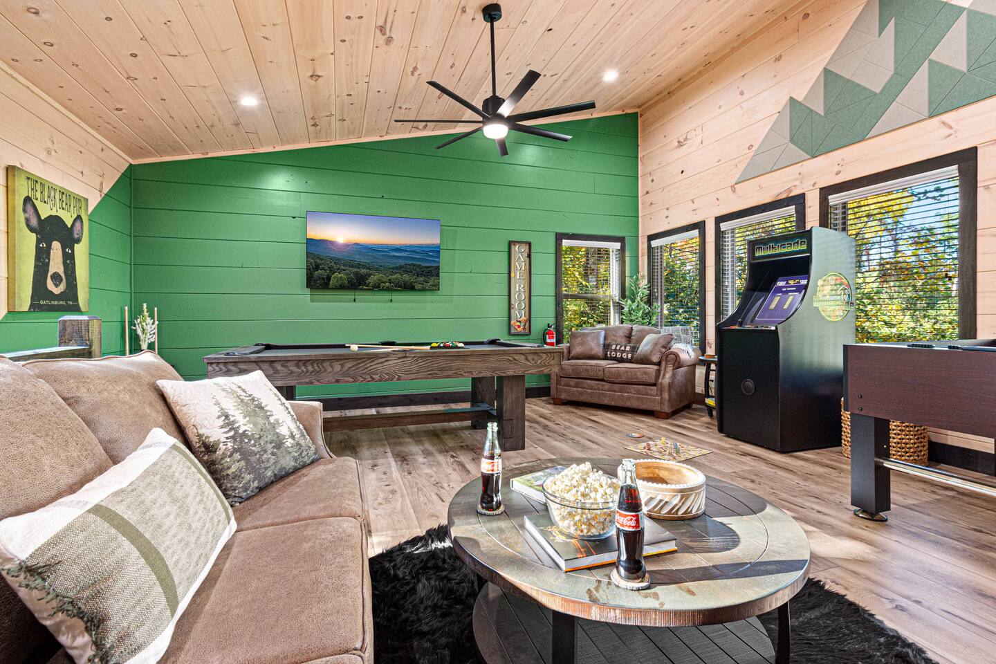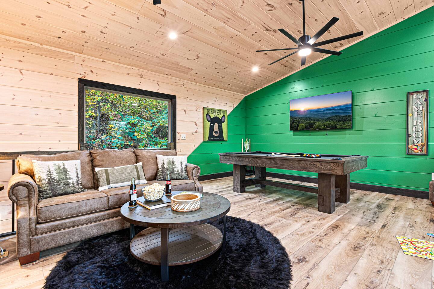 This newly built mountain-modern cabin, accessed from fully paved roads, was designed with comfort in mind. Pour a coffee from the stocked coffee bar or explore the game room, which features foosball, an arcade game, board games, and a pool table. Outside, unwind in the hot tub, gather around the custom fire pit, or take in forest views from the terrace while others play cornhole. With two king suites and three added beds, Pearl Woods Lodge offers modern comfort that is close to it all.