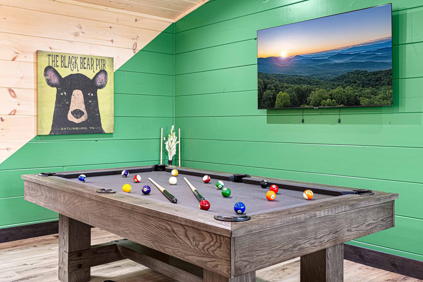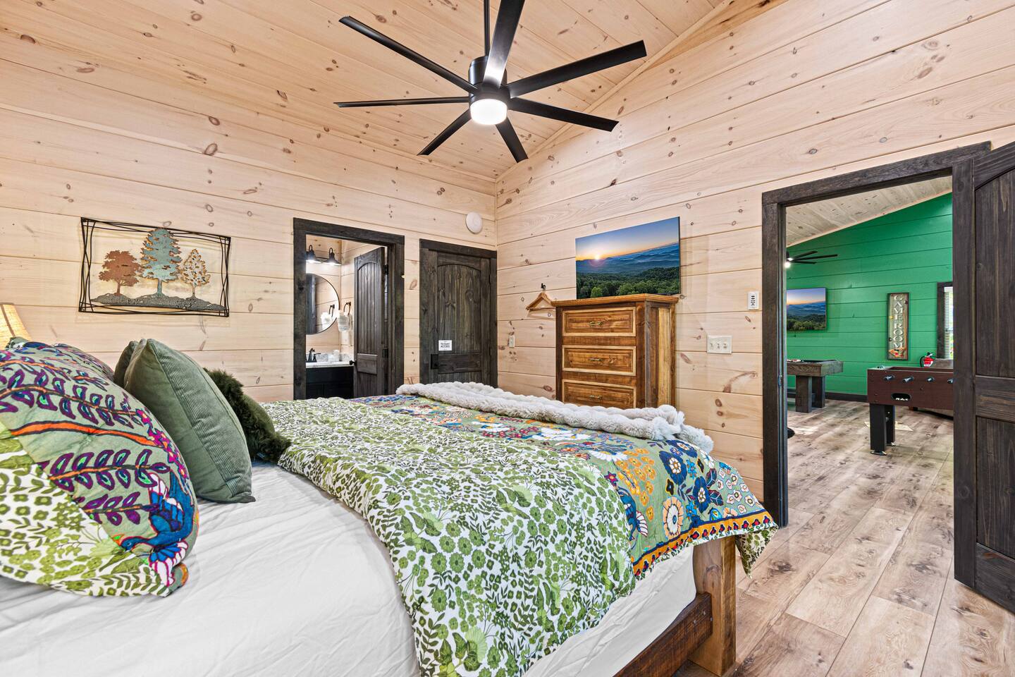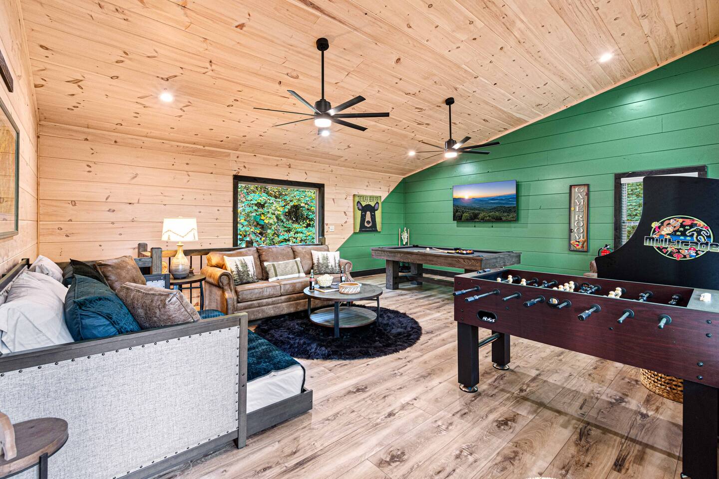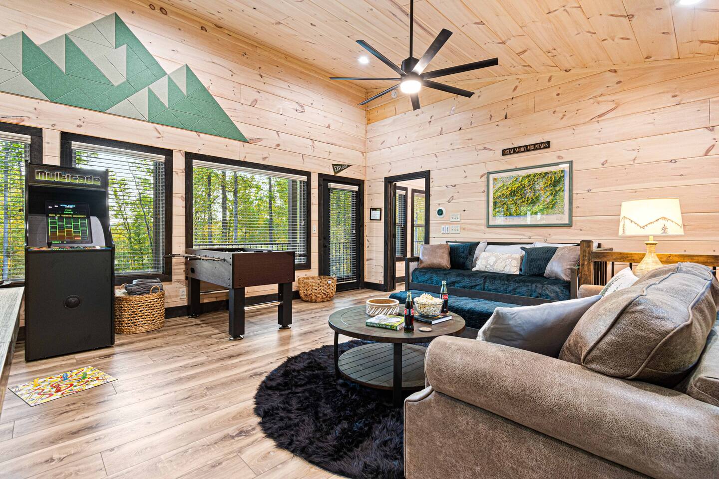 This newly built mountain-modern cabin, accessed from fully paved roads, was designed with comfort in mind. Pour a coffee from the stocked coffee bar or explore the game room, which features foosball, an arcade game, board games, and a pool table. Outside, unwind in the hot tub, gather around the custom fire pit, or take in forest views from the terrace while others play cornhole. With two king suites and three added beds, Pearl Woods Lodge offers modern comfort that is close to it all.