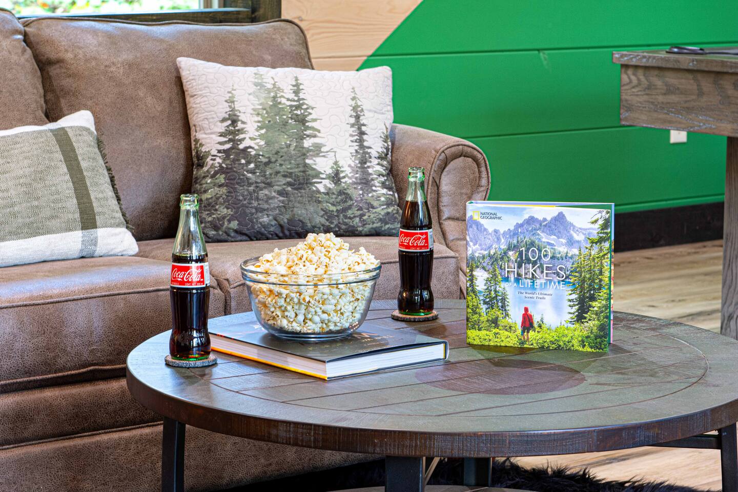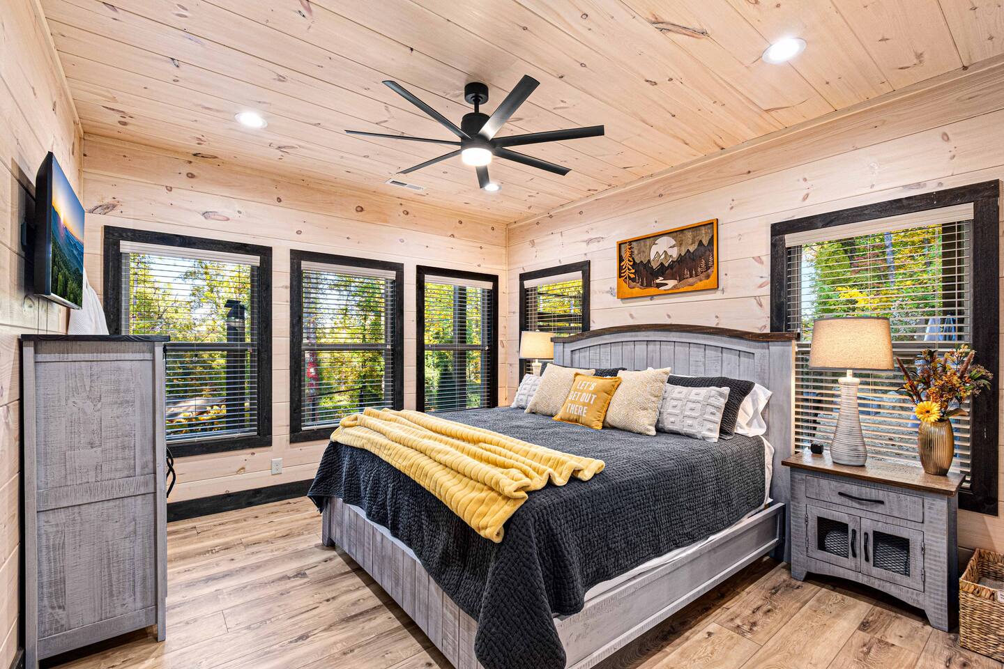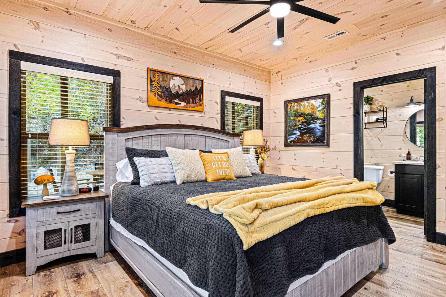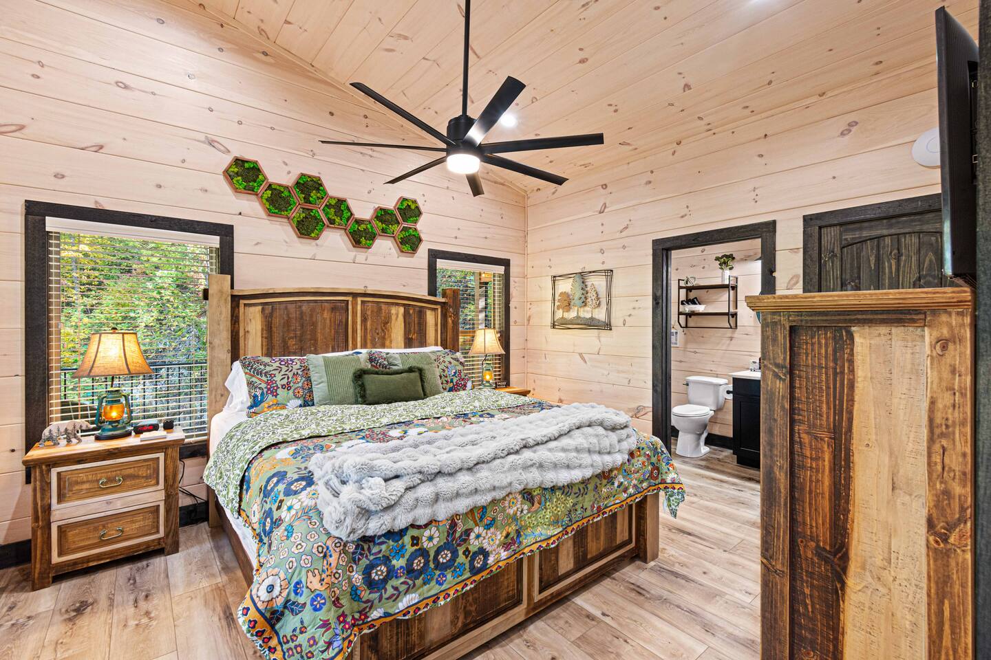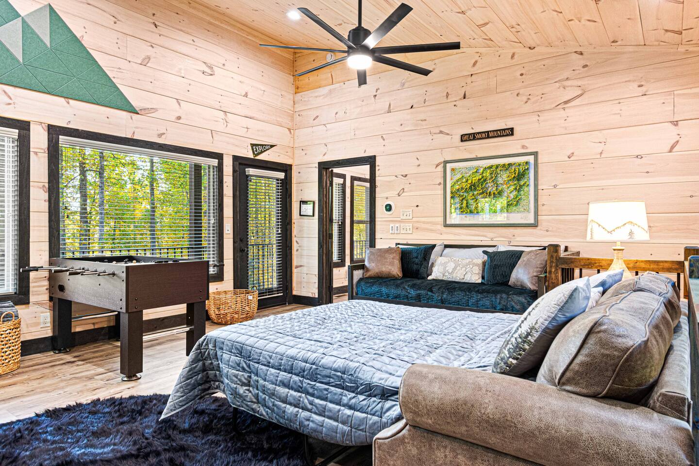 This newly built mountain-modern cabin, accessed from fully paved roads, was designed with comfort in mind. Pour a coffee from the stocked coffee bar or explore the game room, which features foosball, an arcade game, board games, and a pool table. Outside, unwind in the hot tub, gather around the custom fire pit, or take in forest views from the terrace while others play cornhole. With two king suites and three added beds, Pearl Woods Lodge offers modern comfort that is close to it all.