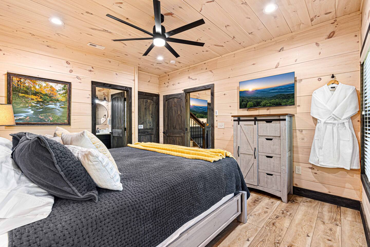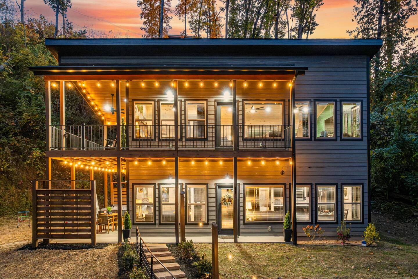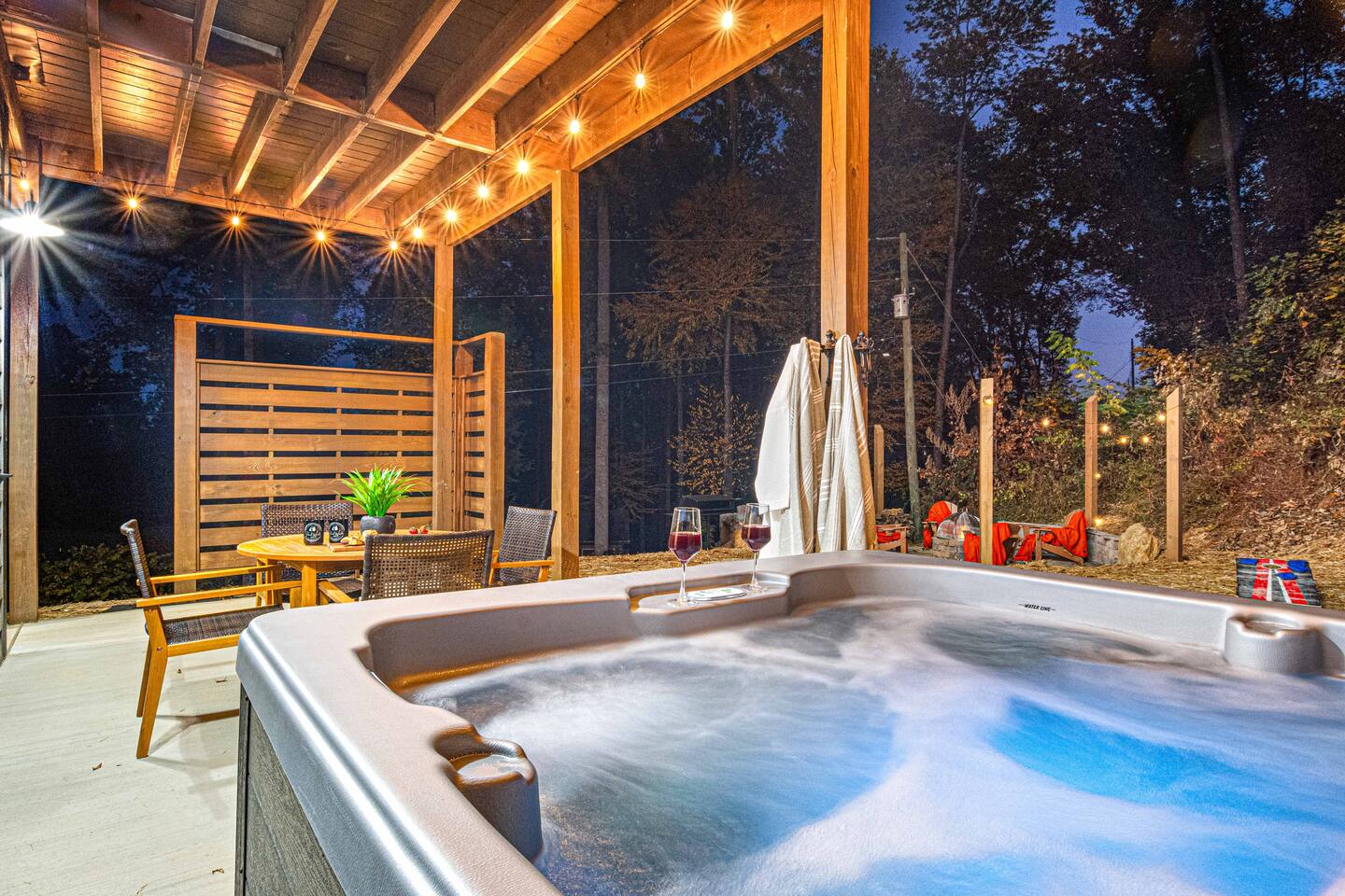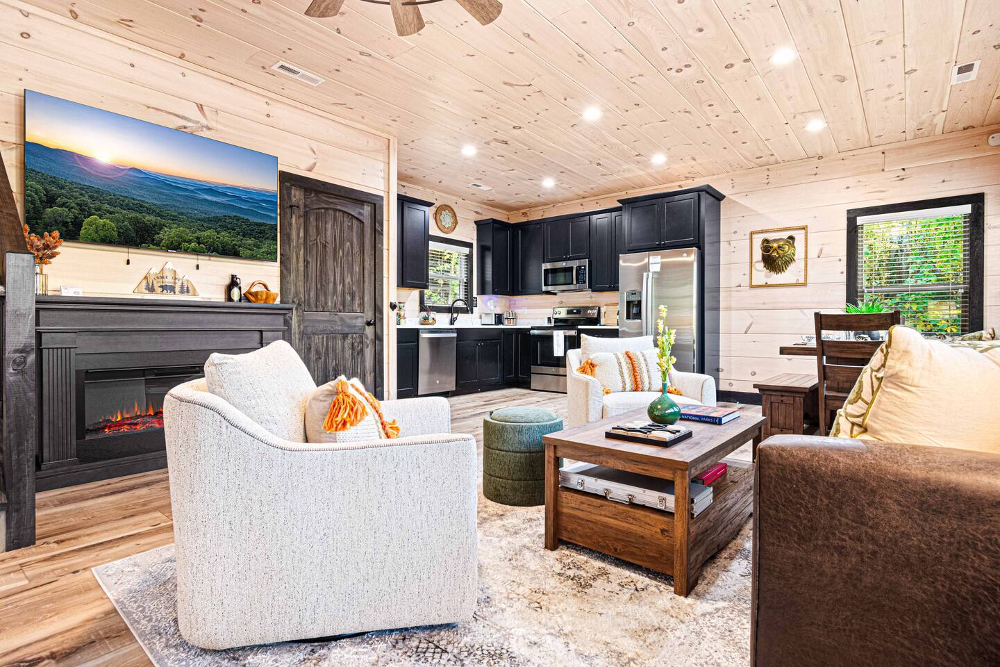 "Modern Comfort + Close To It All" is more than a clever tagline - it's the essence of Pearl Woods Lodge. Here, you'll find thoughtful touches like a stocked coffee bar, outdoor blankets, and upgraded bedding which offer a reprieve from your daily routine. This newly constructed, modern gem is tucked in the forest less than 1 mile from the Foothills Parkway and serves as a centrally located gateway to an idyllic Smoky Mountain experience. We’re just 3 miles from either Gatlinburg or Pigeon Forge, and only 6.5 miles to Great Smokey Mountain National Park. The home is well suited for families who prefer a private experience where they can enjoy their own space or for friend groups traveling together. We've provided trip essentials for you like soaps, shampoos, and paper products. But, we've also furnished supplies for the coffee bar, a supply of firewood, and plenty of kitchen products to make dining in a 'real' option. But, we go beyond that. There are kid-friendly dishes, utensils, books and games. And we've done the same for you - games, Turkish robes, and plenty of outdoor opportunities to soak in this mountain experience.